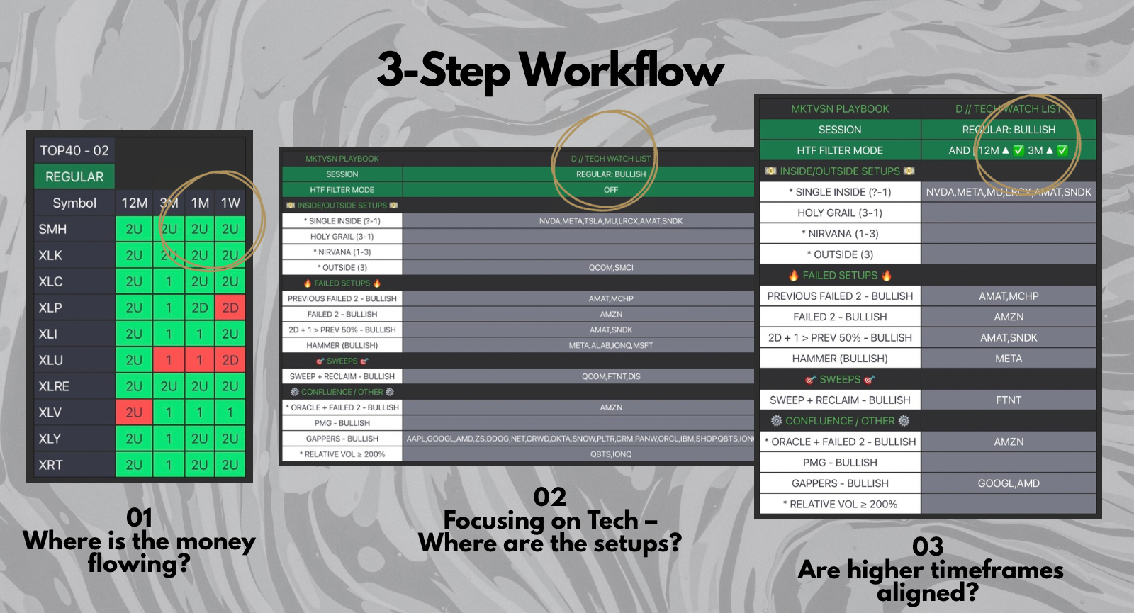 At the center of MarketVision is a simple 3-step workflow: identify where the money is flowing, scan for setups within that area, and confirm trend alignment before executing. Each part of the system has a role, so instead of jumping between charts, you move through a clear process from research to execution.